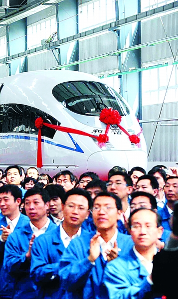 中国国产时速350公里CRH3“和谐号”动车组在中国北车集团唐山轨道客车有限责任公司下线,标志着中国铁路技术装备现代化取得又一重大成果。新华社记者 王晔彪摄