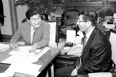 图为韩国土地住宅公社理事、绿色城市本部长朴宽民先生(左)接受本报记者专访。 刘军摄