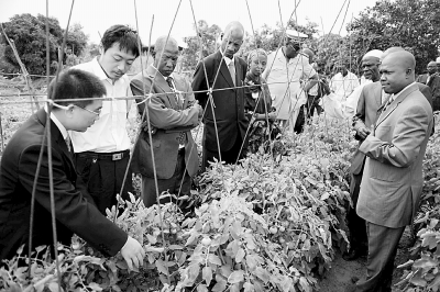 12月9日,在塞内加尔首都达喀尔远郊桑加勒卡姆镇的中国农业技术示范基地,中国援塞农业专家张本俊(左一)向塞方官员介绍西红柿的种植技术。