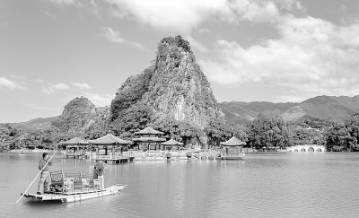 南国风光,肇庆独秀,蓝天白云。望小城内外,春光无限。七星上下,风光秀丽。山披素装,自然森林,欲与世界一比高。须晴日,看青山绿水,分外秀美。