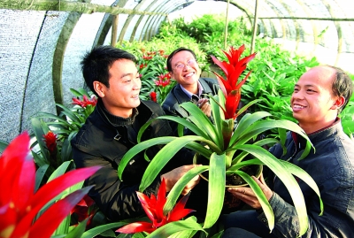 12月16日,江西省龙南县里仁镇干部与谢文俊(左一)一起研讨花卉的销售渠道。2004年,毕业于江西农业大学的谢文俊回乡创建了自己的花卉基地。为帮助大学生掌握创业技术,该县在创业服务年活动中,创建了8个孵化园,新建了70多个种养基地,并组织专业技术人员对他们进行技术培训,提供技术服务。同时,设立了专门的大学生创业扶持基金,吸引了越来越多的大学生回乡创业。