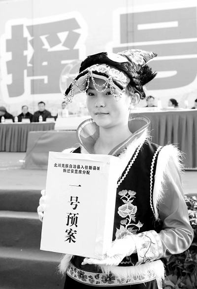 12月18日,一名工作人员展示经摇号确定的北川县入住新县城拆迁安置房分配一号预案。当日,四川北川羌族自治县举行首次新县城入住摇号分房,第一批3984户村民经过公示确认后,将正式入住自己在北川新县城里的新家。据介绍,本次摇号分房共设6套分配预案,最终在公证等部门的监督下,由村民代表摇出一号分配预案并被认定。新华社发(余坪摄)