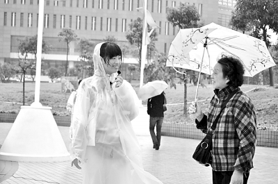 前几天广州下起了雨,场馆负责人给在外围开展志愿服务的志愿者派发了雨衣,“雨衣只能挡雨,风吹了的时候还是很冷的,特别是脖子,雨衣遮不到,有时候雨水会飘上去,就更冷了,所以我就把‘志愿彩’围在脖子上,感觉暖多了!”华南理工大学体育场外围的观众引导志愿者陈雅林,对自己“时尚”的御寒方法十分得意,“虽然很冷,但是看到观众感激的笑容我心里觉得很温暖。”陈雅林说。