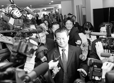 12月19日,在纽约联合国总部安理会磋商室外,记者包围采访朝鲜常驻联合国代表申善昊(中)。当日,联合国安理会就朝鲜半岛局势举行紧急闭门磋商。