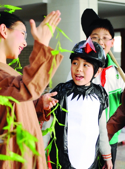 日前,北京团市委、市教委、市科委举办了以“低碳生活,健康成长”为主题的北京青少年科普短剧汇演。这些由学生们自编自演的剧目,以社会热点为故事背景,向观众传递低碳理念。这是北京市崇文小学学生正在演出低碳科普短剧。本报记者 刘新武摄
