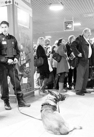 12月20日,在比利时首都布鲁塞尔火车南站,等待乘坐高速火车前往英国的旅客排成长龙,安全部门也动用警犬加强戒备。近两天,由于大雪导致伦敦机场关闭,大批原定乘坐飞机前往或者返回英国的旅客被迫选择火车出行。新华社记者 王晓郡摄