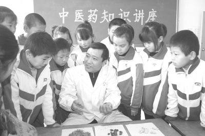 日前,山东省无棣县中心医院的主治医师杨玉振(中)来到海丰办事处中心小学,为学生们讲解中医药常识,让孩子们和祖国中医文化进行零距离接触。据了解,为了让孩子们了解祖国医药发展史,该县组织开展了“中医药知识进校园”讲座,为全县中小学生普及中医药知识。蒋惠庆吴长顿摄