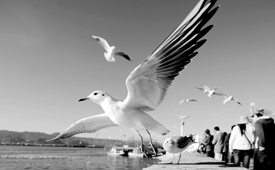 12月23日,一只红嘴鸥在云南昆明滇池大堤上振翅起飞。红嘴鸥是“春城”昆明的“荣誉市民”。每年市政府都拨出专款、组织专人为红嘴鸥投食。新华社记者 蔺以光摄