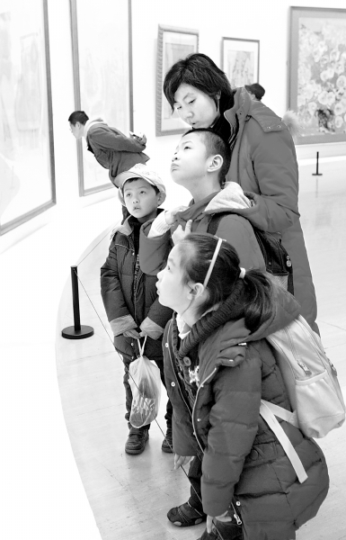 “时代心象——中国艺术研究院中国画院第二届院展”日前在中国美术馆开幕,展出作品200余幅,参展艺术家均为活跃在当代中国画坛的画家。图为北京灯市口小学老师带领小朋友们前来观看画展,感受艺术,陶冶心灵。