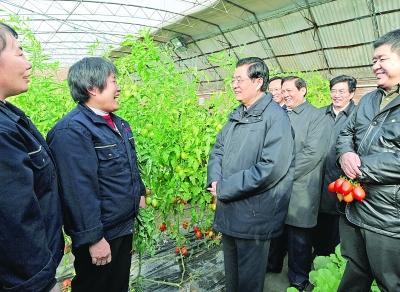 “菜篮子”与群众生活息息相关。近一个时期,保障蔬菜供应、稳定蔬菜价格成为广大群众普遍关注的问题。带着这个问题,胡锦涛来到北京金福艺农农业科技发展有限公司考察。