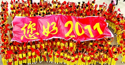 12月30日,江西省靖安县双溪镇小学学生举起“您好2011”字样的横幅,喜迎新年的到来。当日,江西省靖安县双溪镇小学600多名学生在校园操场举行“快乐奔向2011,欢心鼓舞迎新年”为主题的传统腰鼓、舞蹈等文艺活动,迎接2011年。