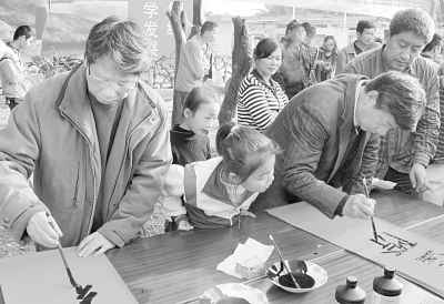 2011年元旦,中国美协以“送欢乐、下基层”为主题,组织全国知名画家,深入海南乡村,把党和政府的关怀和温暖送到田头村间。美术家一行来到海南省琼海县阳江镇红色村——红色娘子军的诞生地,送去了节日礼品大米和食用油,并为村民们现场题写春联。图为中国美协分党组书记吴长江(右)、中国美协副主席许钦松在写春联。