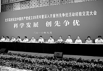 三是以创先争优活动为抓手,在日常工作中彰显先进。创新活动载体,引导党组织“创建党建先进”、教师党员“争做育人标兵”、学生党员“争做成才表率”,推行“创先争优、从我做起”党员公开承诺。注重党群共建创先争优,开展联合主题党团日活动,组织联合培训会,形成齐争共创良好局面,共同推动首都高等教育科学发展,为实现国家和首都经济发展方式转变提供强大的人才和智力支撑。