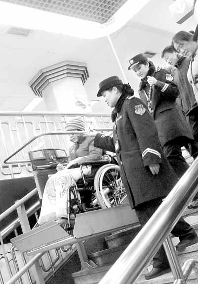 日前,北京地铁王府井站工作人员在协助行动不便乘客搭乘地铁。北京市无障碍设施建设完善,为全体公民创造了一个安全、方便的出行环境。 本报记者 郭红松摄