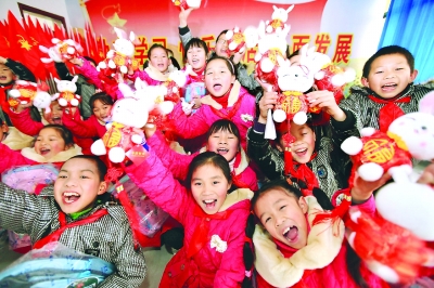 1月13日,花朝小学的同学们开心地展示新年礼物。当日,由重庆市北部新区教委、团工委组织的“冬日暖阳,幸福北部”活动在花朝小学拉开帷幕,为在校农民工子女送去新年礼物和祝福。106名学生收到了新棉袄、书包,以及寓意新年快乐的“吉祥兔”玩偶。新华社记者 陈诚摄