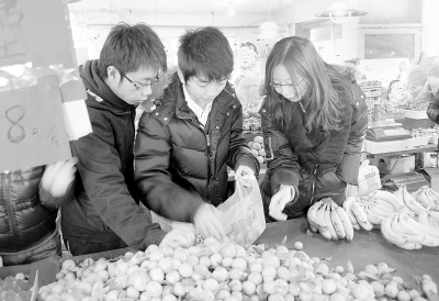 辽宁大学工商管理学院的几名大学生组成“买菜网”实践小组。他们从蔬菜市场进货,通过互联网销售蔬菜水果,一个多月下来,收入达2000多元。 新华社发(姜冰摄)