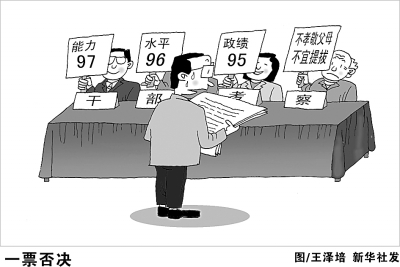 | 一票否决 “要想升迁首先要有父母德孝证明,无德不孝一律不考虑。”近日,河北省魏县一则关于干部任用的规定引发争议:有人认为自古忠孝不能两全,恪守孝道不见得就忠于职守;有人则认为百善孝为先,对亲人不孝则公德难存无法取信于民。自2008年以来,魏县提出了“德孝治县”的施政理念,让普通百姓讲德孝,干部首先得带头。新华社发 |