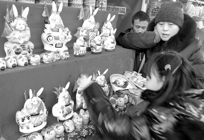 传统的兔年春节到来之际,北京一派欢乐祥和的节日气氛,兔子成为人们喜爱的吉祥物。这是北京街头热卖的泥雕兔儿爷。 本报记者 刘新武摄