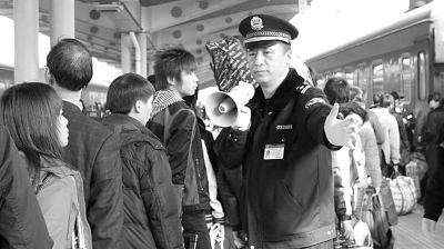 今年春运期间,大连铁路公安处从领导干部到普通民警都战斗在保春运第一线,24小时轮流值班,分岗把守,有序分流,保证旅客平安乘车。图为近日民警在大连火车站维持秩序。本报通讯员 张海邦摄
