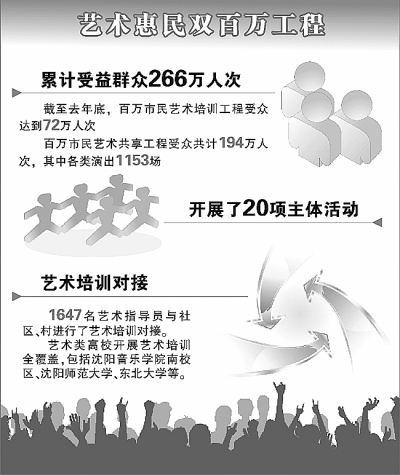截至2010年年底,沈阳市百万市民艺术培训工程受众达到72万人次。其中,高校系统培训40万人次,市直各艺术单位和社会团体培训13万人次,各区县(市)艺术指导员培训19万人次。百万市民艺术共享工程受众共计194万人次。其中,市属专业院团演出294场,观众达43万人次,市、区群文系统组织各类演出859场,观众151万人次。“中国诗人采风团走进沈阳”、“辽中近海文化广场‘农家乐’国庆晚会”、“市属专业院团公园演出月”、“首届市民合唱艺术节”、“钢琴大师郎朗琴声进社区”等20项主体活动场场爆满,盛况空前。截至2010年底,艺术惠民“双百万”工程累计受益群众达到266万人次,实现了艺术指导员进社区、艺术类院校开展艺术培训、市属专业院团和两级文化馆公益演出“三个全覆盖”,市属专业院团公益演出、市属媒体宣传“双百万”工程“两个常态化”。