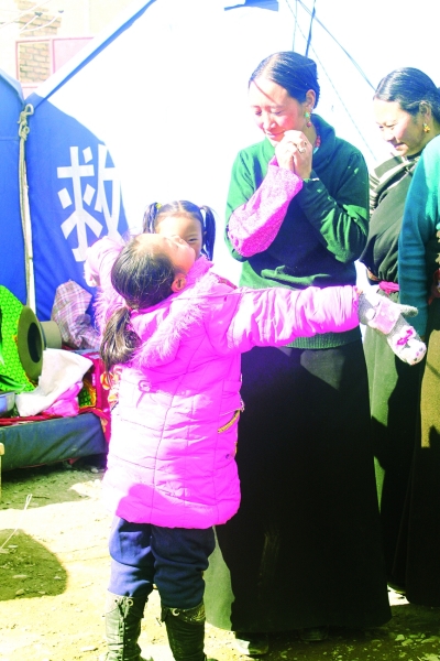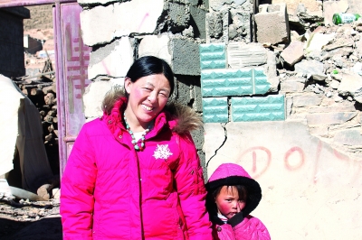 | 看卓措吉和女儿西然朵梅在震毁的自家老屋前 本报记者 谢文摄 |