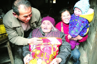 | 93岁的张素英老人(中)接到本报的新年礼物 张文耀、夏侯昭珺摄 |
