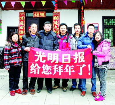 | 本报记者(左三左四)给汶川县啣凤岩村老乡拜年 张佳摄 |