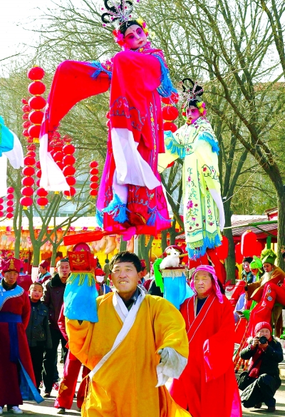 | 太原市徐沟镇农民在社火节表演“背棍”节目本报记者 赵洪波摄 |