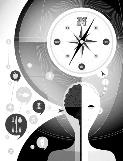 后来回到斯坦福大学演讲,我向听众提出了同样的要求。这些听众都是杰出的学者,是各类科学和天才奖项的得主,有些人已经在这间屋子听了40多年的演讲。我请他们闭上双眼(这样就无法偷看作弊了),然后指出北在哪儿。很多人没有指,因为他们找不着北了;而那些指了的人则是先想了一会儿,然后抬手——哈!指向什么方向的都有。这个测试我在很多地方演讲时都重复过,在哈佛和普林斯顿,在莫斯科、伦敦和北京,结果都差不多,很多杰出人士都找不着北。