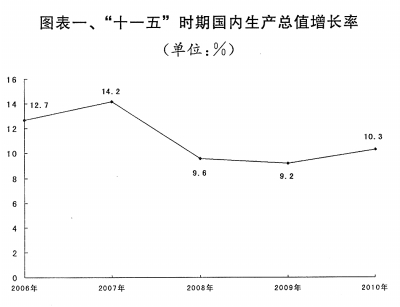 去年,我国经济社会发展环境极为复杂,各类自然灾害和重大挑战极为严峻。在中国共产党的坚强领导下,全国各族人民深入贯彻落实科学发展观,按照十一届全国人大三次会议审议批准的国民经济和社会发展计划,坚持实施应对国际金融危机冲击的一揽子计划,加快推进经济发展方式转变,巩固了经济社会发展良好势头。计划执行情况总体是好的,“十一五”规划确定的主要目标和任务胜利完成。