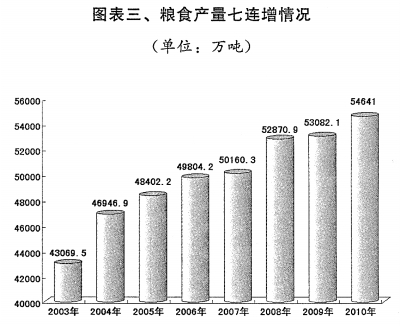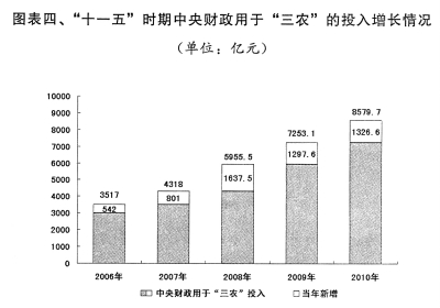强农惠农政策有效实施。全年中央财政用于“三农”方面的支出8579.7亿元,比上年增长18.3%,其中,用于农业和农村建设的中央预算内投资1928亿元,占全部中央预算内投资的比重达到49%。耕地保护工作进一步加强,全国整治土地130多万公顷,新增耕地30多万公顷。全国新增千亿斤粮食生产能力规划全面实施,棉油糖基地、植保工程、动物防疫体系、种养业良种工程得到加强。制定并实施了加强中小水利设施建设、促进农业机械化、保障蔬菜生产供应等方面政策。规划内病险水库除险加固任务全面完成,第二轮小型病险水库除险加固启动实施。支持建设了一批农产品批发市场、粮油仓储、农产品冷链物流等流通基础设施。小麦、稻谷最低收购价每50公斤比2009年平均提高3元和6元,大豆、油菜籽临时收储政策得到较好落实,化肥供应较为充足。对种粮农民实行“四项补贴”的规模达到1226亿元。