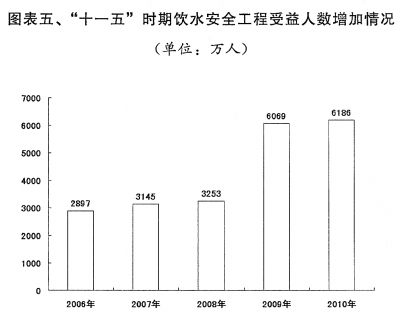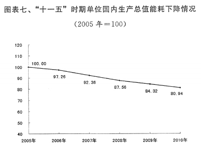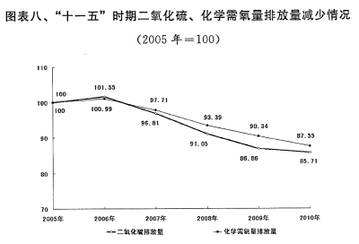 节能减排目标基本实现。2010年,用于节能减排方面的中央预算内投资333亿元,中央财政专项资金518亿元,分别比上年增长1.4倍和73%。积极推进十大重点节能工程,形成节能能力3310万吨标准煤。大力实施节能产品惠民工程,推广高效节能空调近3000万台、节能汽车100多万辆、高效照明产品1.6亿只。新能源汽车示范推广试点启动实施。国家“城市矿产”示范基地建设积极推进。支持城镇污水垃圾处理设施建设,全年新增城镇污水日处理能力1900万立方米、城市生活垃圾日处理能力6.8万吨;城市污水处理率、城市生活垃圾无害化处理率分别达到76.9%和72.5%,比上年提高1.6个和1.2个百分点。2010年,单位国内生产总值能耗下降4.01%,二氧化硫、化学需氧量排放量分别下降1.32%和3.08%;万元工业增加值用水量下降9.6%,工业固体废物综合利用率提高2个百分点。过去五年,单位国内生产总值能耗累计下降19.06%,二氧化硫和化学需氧量排放量分别下降14.29%和12.45%,万元工业增加值用水量下降36.7%,基本或超额完成“十一五”规划目标。