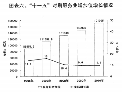 服务业稳定发展。启动了服务业综合改革试点,运用服务业发展引导资金,支持重点领域和薄弱环节加快发展,颁布实施了促进节能服务产业发展的意见。2010年,服务业就业人数占就业总人数比重达到34.8%,服务业增加值占国内生产总值的比重为43%。