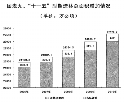 生态环境保护迈出新步伐。退耕还林、退牧还草成果进一步巩固,天然林资源保护一期工程全面完成,长江上游、黄河上中游全面停止了天然林的商品性采伐,生物多样性得到保护和恢复。2010年,全国新增造林面积592万公顷,实施退牧还草666.7万公顷,综合治理水土流失面积4.2万平方公里。全国水资源综合规划颁布实施,“三河三湖”、黄河中上游、三峡库区及上游、渤海、松花江、丹江口库区及上游等重点流域污染治理积极推进,太湖流域水环境综合治理总体方案全面实施。