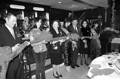 图为捷克总统夫人克劳索娃(左三)和中国驻捷克大使于庆泰(左五)为捷克华侨华人青年联合总会成立剪彩。(吕淑梅摄)