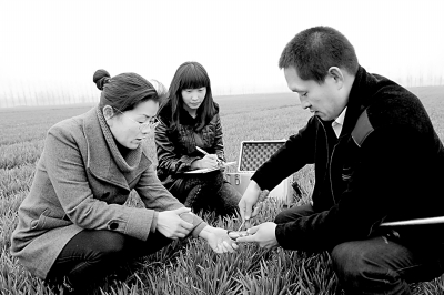近日,山东省枣庄市峄城区气象部门科技人员在麦田取土监测土壤干湿程度。对全区小麦麦苗墒情和苗情生长情况进行监测,为小麦田间管理当好参谋。 本报记者 邢兆远 通讯员 孙启路摄