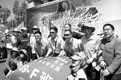 图为清华大学EMBA班学生在云南省富源县“胜境关跨省交接仪式”上庆贺“清华一百年 重走联大路·贵州段”的胜利。今天,参加“清华一百年 重走联大路”的151位师生,顺利完成贵州段的徒步行走,抵达云南省富源县。