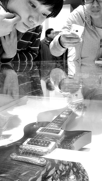 由文化部中外文化交流中心主办的《漆彩永恒———全龙福漆画展》4月6日在中国美术馆举办。此次展览展出了韩国当代著名漆艺大师全龙福近年的代表作《回乡》等50余件漆画精品。这是全龙福第一次在漆艺故乡中国举办展览,是中韩漆艺交流的新篇章。本次展览的主要策展人是被誉为中国现代漆画之父的乔十光先生。图为观众在欣赏全龙福的漆艺吉他。 本报记者 谌强摄