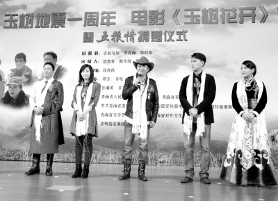 在青海玉树地震一周年之际,一部以玉树抗震救灾为背景、反映藏汉民族团结题材的电影《玉树花开》今天在京首映。影片用生动的电影语言讲述了面对突如其来的自然灾难,各族人民团结一心、军民众志成城抗震救灾的壮举。图为《玉树花开》演职人员在北京政协礼堂与观众见面。 本报记者 高腾、何平摄影报道