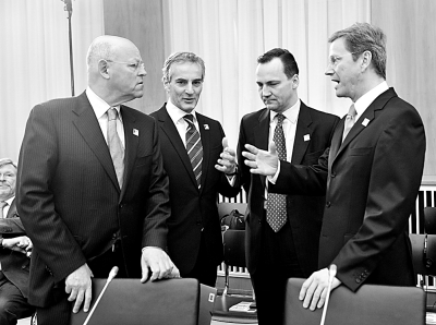 4月15日,在德国首都柏林举行的北约外长会议上,德国外长韦斯特韦勒(右一)、波兰外长西科尔斯基(右二)、挪威外交大臣斯特勒(左二)和荷兰外交大臣罗森塔尔交谈。为期两天的北约外长会议15日在柏林继续举行。 新华社发
