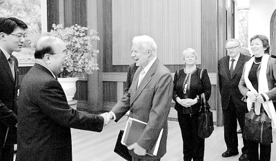 朝中社4月26日提供的照片显示,朝鲜外务相朴义春(左二)在平壤百花园迎宾馆会见到访的以美国前总统卡特(左三)为团长的“元老集团”代表团一行。卡特一行26日上午乘专机抵达平壤开始访问,一同乘机抵达的还有芬兰前总统阿赫蒂萨里、爱尔兰前总统鲁滨逊和挪威前首相布伦特兰。新华社/朝中社