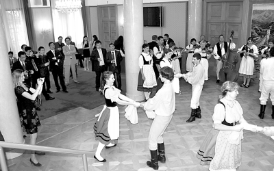 我旅捷华侨华人青年组织、中资机构、留学生代表、捷青年联盟等120余人,日前在中国驻捷克大使馆共同举办“五四”青年联谊会。联谊会上我使馆青年与部分留学生、捷克青年风笛乐团、晨星歌舞团分别表演了具有中捷浓郁民族特色的精彩节目并品尝中国特色食品,大家共同载歌载舞、共同庆祝“五四”青年节。图为联谊会现场。