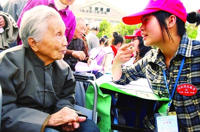5月3日,江苏省镇江市润州区金山街道迎江路社区开展“迎‘五四’关爱老人进社区”活动,来自江苏科技大学的学生、金山社区卫生服务中心医护人员和“叨叨团”志愿者走进社区,为老年人提供心理咨询等。新华社发(石玉成摄)