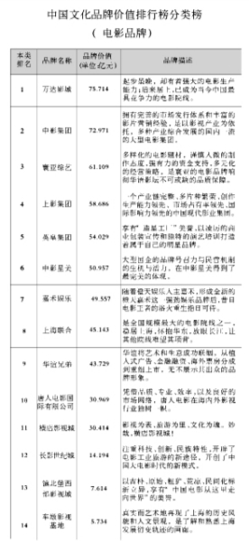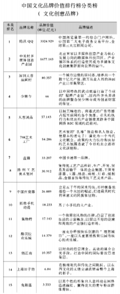可以看出,我们不研究文化企业的资产收益、资金利用、投资收益、固定资产等情况。我们的指标选取及研究方向是,文化品牌是否具有(1)较大的市场份额;(2)较高的超值创利能力;(3)较强的出口能力;(4)商标是否具有较广泛的法律效力和不断投资的支持;(5)是否具有较强的超越地理和文化边界的能力。基于这样的评价标准,我们这次上榜发布了15个类型,共200个品牌。