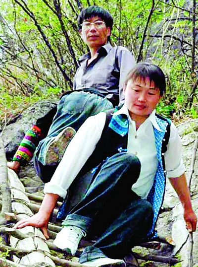 到了第二年,李桂林把妻子陆建芬也动员到山上来教书。从此,“天梯”的两头,多了两个护送学生的身影,寒冬酷暑,春去秋来,从不间断。