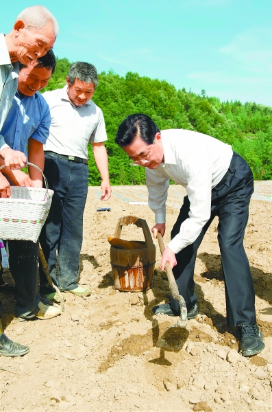 在位于十堰市东部的丹江口市土关垭镇龙家河村,胡锦涛走进一片受旱严重的农田,用手翻开田里的土壤查看墒情。一位上了年纪的村民告诉总书记,这里好久没下过一场透雨,流经村子的小河几十年都不曾缺过水,如今却断流了。得知村里现在正把插不上秧的水田改成旱地,抢种玉米、花生、大豆等耐旱作物,胡锦涛走上前去,亲自刨土、点种、舀水、浇地,和村民一起补种玉米。总书记希望乡亲们精心搞好抗旱田间管理,能补种的尽量补种,能改种的抓紧改种,努力把损失降到最低程度。胡锦涛又特别叮嘱当地干部,现在是抗旱的关键时刻,要把抗旱作为当前农村工作最紧迫的任务,动员各方力量,采取综合措施,加大资金、物资、技术等方面的保障力度,确保人畜饮水,确保不误农时,坚决打赢抗旱这场硬仗。