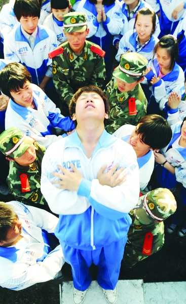 6月2日,武警吉林省边防总队延边支队直属机动队官兵来到龙井市三中,与师生共同开展信任背摔、齐心协力、同心同行等心理拓展训练,让学生放松心情,轻松迎接高考。本报通讯员 管清江摄