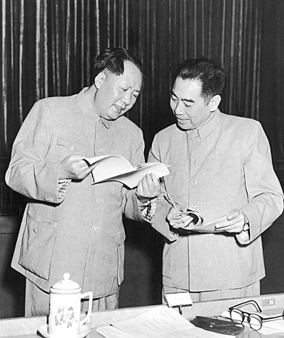 毛泽东正在伏案看文件,发现周恩来到了跟前,连忙起身,两人拿着文件开始交流,看上去心情都不错(见图一)。