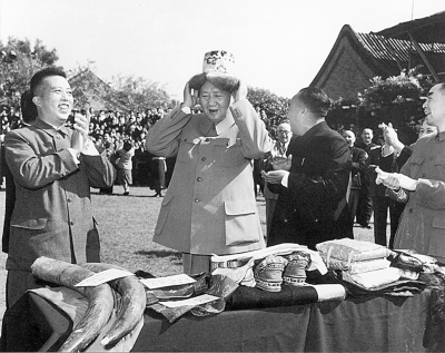 他试戴少数民族参观团送上的富有民族风情的帽子,双手护着帽沿儿,乐呵呵的,眼光似乎还在搜索其他礼物,随时准备再试上一把(见图四);