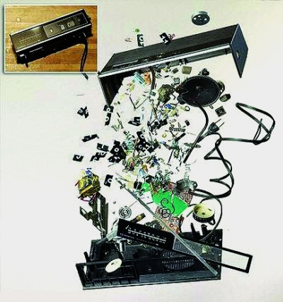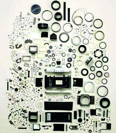 不是只有拆机网站的高手们才热衷于肢解各种产品,摄影艺术家们似乎也迷上了这项运动。从老式厨房用具到复古家用电器,录音机、面包机、打字机、电熨斗,没有什么是不能拆卸的,不但如此,他们还要在视觉上颠覆你对电器的认知。加拿大杉野工作室的摄影师托德·麦克莱伦拆得更为彻底——在他去年开始拍摄的拆卸系列作品中,连焊到电路板上的元件都被一个个拔下来摆好。除了完整的零件排列静态图,更为引人注目的是那些零件从空中自由落体的运动瞬间。摄影师极富创意地将这些动态画面拍摄下来,颠覆了观众们对于家用电器的视觉认知。